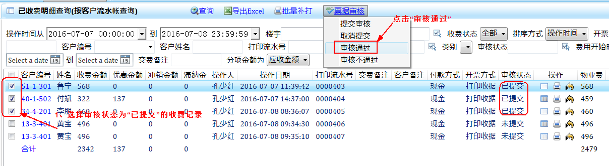 从“当前小区查询-》已收费明细查询-》按客户流水帐查询”菜单进入,选择要提交审核的收费记录,点“票据审核-》提交审核”。提交审核后,审核状态变为“已提交”